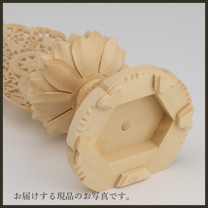光背(こうはい)は、標準的な「唐草光背」です。手作業で細かいところまで彫ってあり、ご本尊を美しく引き立てます。